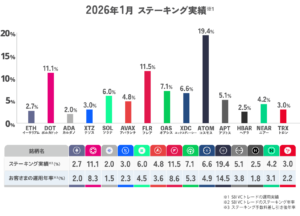 Coincheckの扱っている1銘柄はイーサリアムなので、その他の良く分からない銘柄をステーキングのために無理して持つ必要はないと思います。また、Coincheckのステーキング報酬も最大2.7%なので、ほぼ同じです。